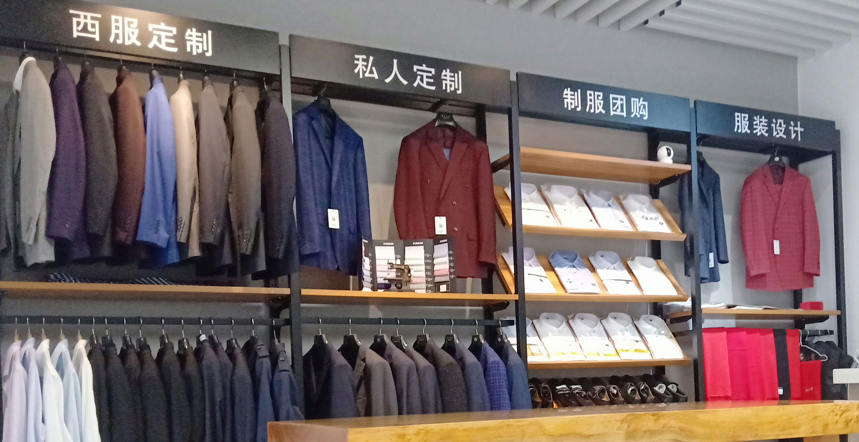 服装品类:设计定制各类职业装,并常年备货多款多价位西服、衬衫、大衣、T恤、冲锋衣等。
